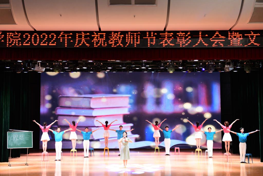 围绕“潜心治学铸灵魂,勇担使命育新人”主题,学校举行了文艺演出,各类节目精彩纷呈。舞蹈《鲜红的党旗》展现了中国人民在党旗的指引下所向披靡,由胜利走向胜利。诗朗诵《心向二十大》表现了对伟大的、光荣的、正确的中国共产党的敬仰之情。舞蹈情景剧《长大后我就成了你》生动展现了薪火相传的传承精神。男声独唱《把一切献给党》和男生二重唱《红旗飘飘》唱出了对党对祖国的无限深情与热爱。舞蹈《教师圆舞曲》点燃了观众沸腾的热情。演出在男女生二重唱《春风十万里》中圆满落下帷幕。