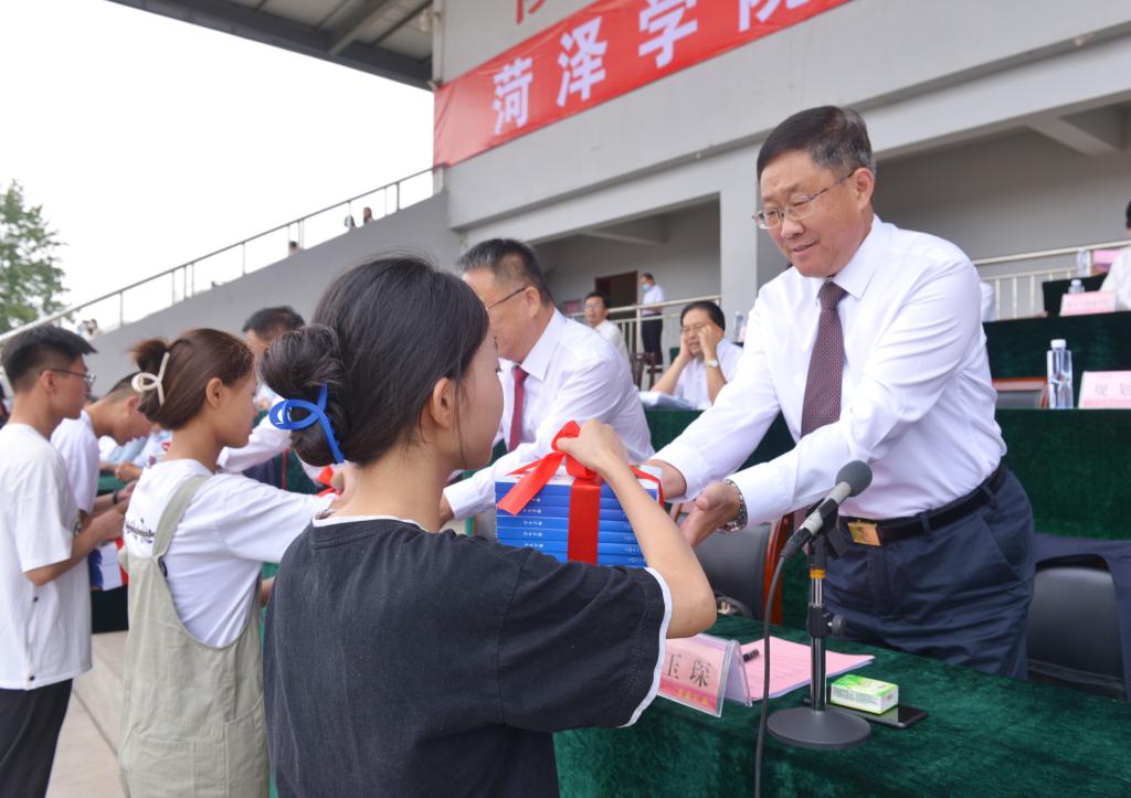 校领导为学生代表发放《学生手册》,希望新一代“菏院人”秉持“修德、笃学、求是、创新”的校训,勇敢地担负起新时代赋予的历史使命。